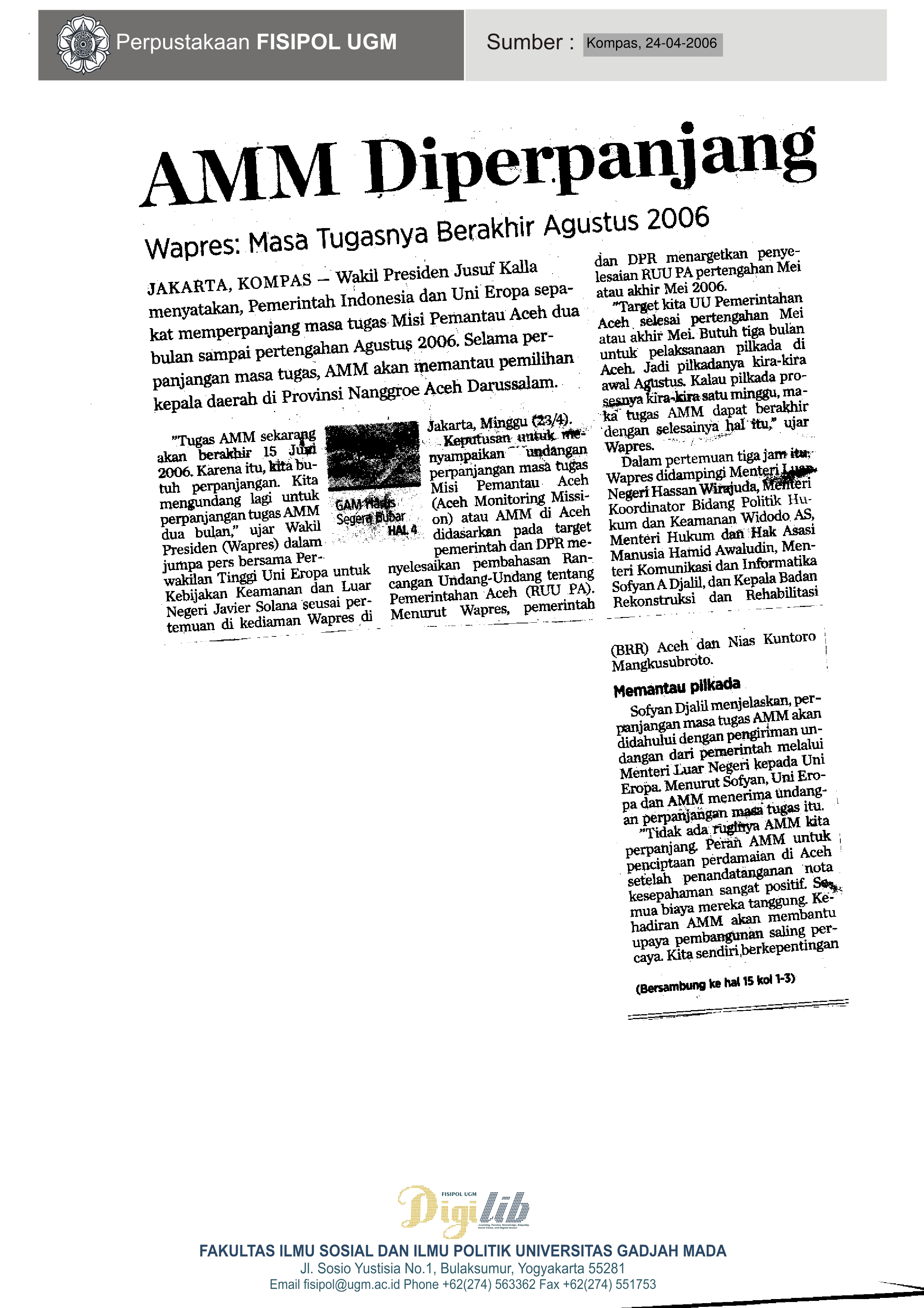 Kliping ini berisi berita tentang pernyataan Wapres Jusuf Kalla bahwa pemerintah dan Uni Eropa sepakat memperpanjang masa tugas Misi Pemantau Aceh selama 2 bulan sampai Agustus 2006